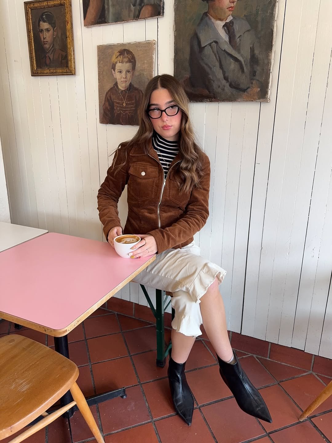 There is something romantic about sipping coffee at a tiny pink café table in a corduroy jacket. The warm brown tone layered over a striped turtleneck feels nostalgic, almost like a modern-day art student moment. Paired with a soft ivory skirt and sleek black boots, it blends cozy textures with sharp lines.