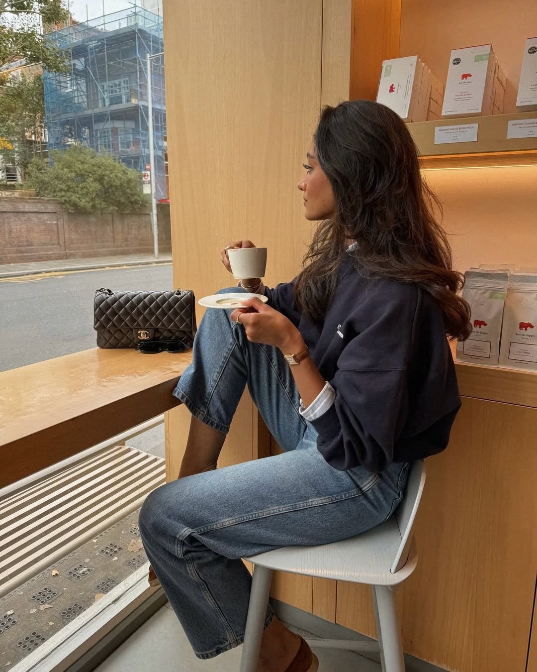 A navy sweatshirt with cuffed jeans and sleek loafers proves that simple pieces can still feel elevated. The gold watch and structured quilted bag bring in just enough shine, while the clean lines keep everything sharp.