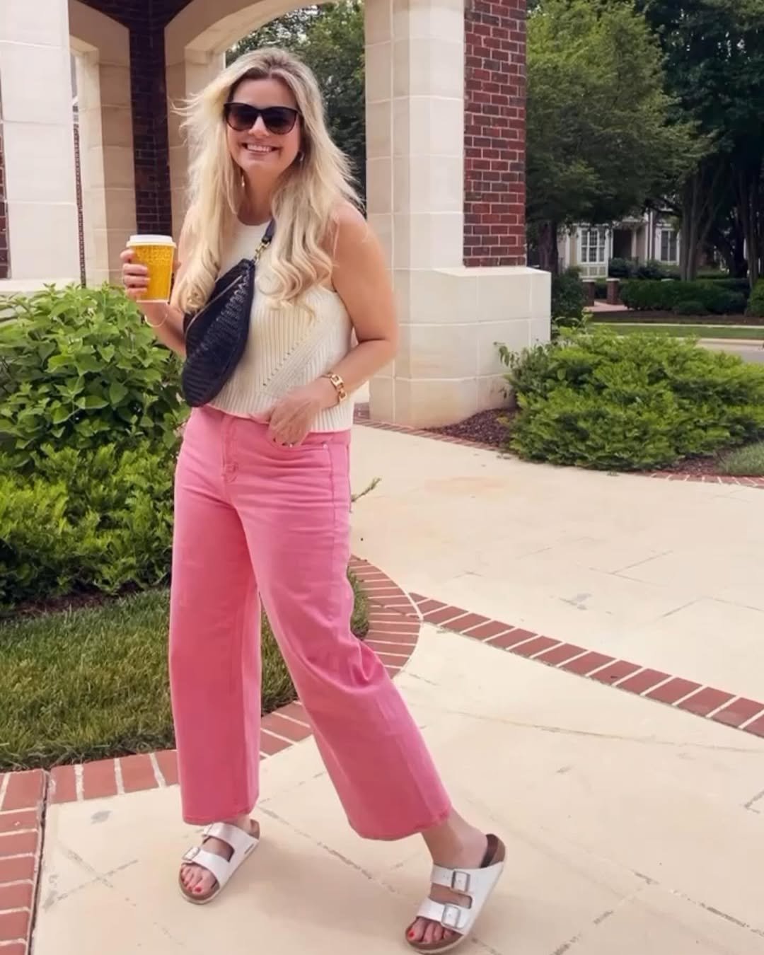 This look is giving effortless Saturday energy in the best way. The pink wide-leg pants feel playful but polished, especially paired with that neutral knit tank and chunky sandals. And the coffee-in-hand moment? Instant main character vibes.