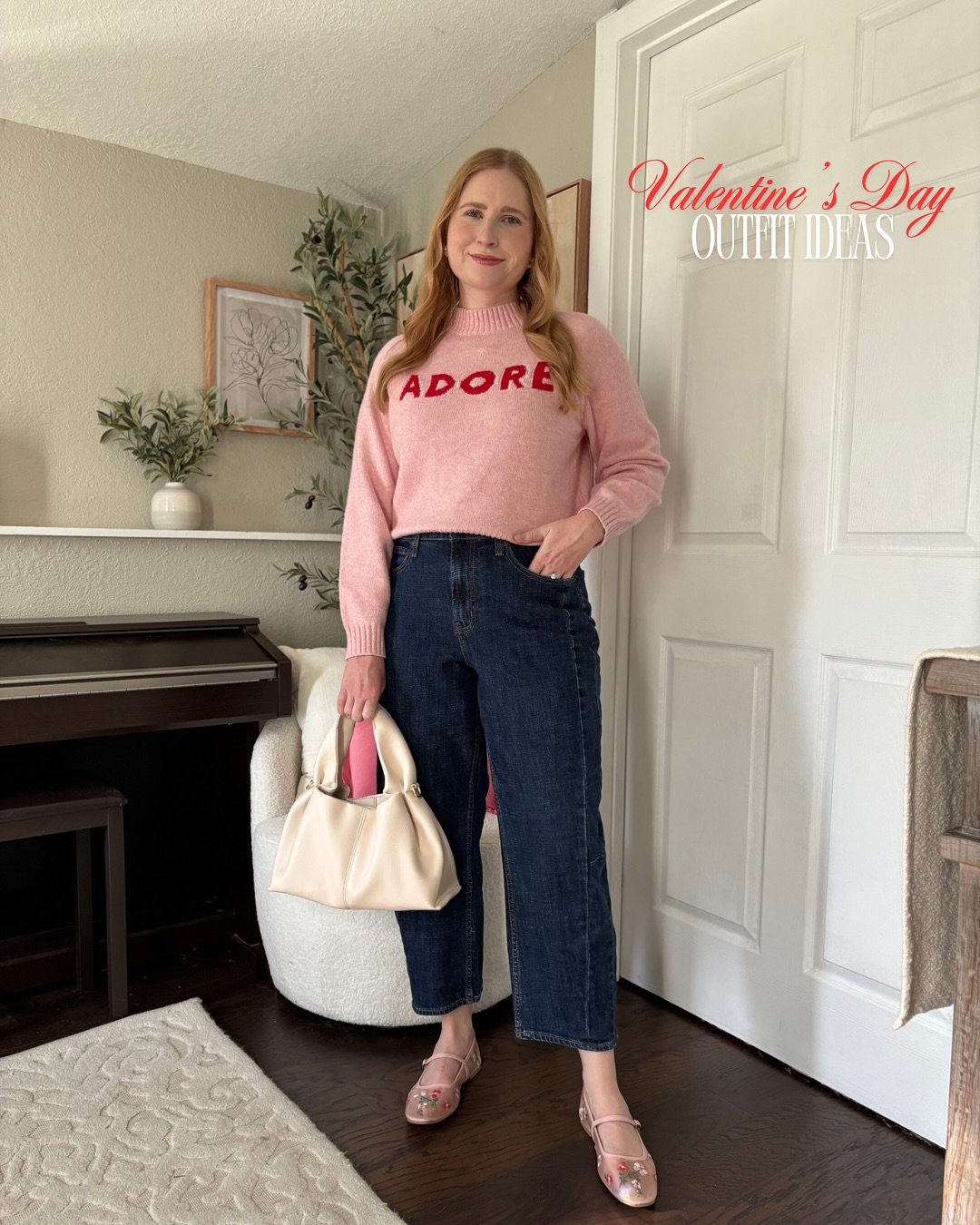 The pink “Adore” sweater with classic straight-leg jeans is subtle but still on theme. It’s giving festive without screaming costume — which honestly is the sweet spot.
