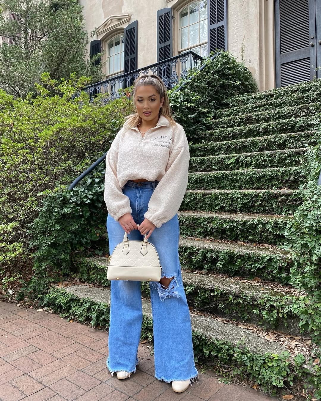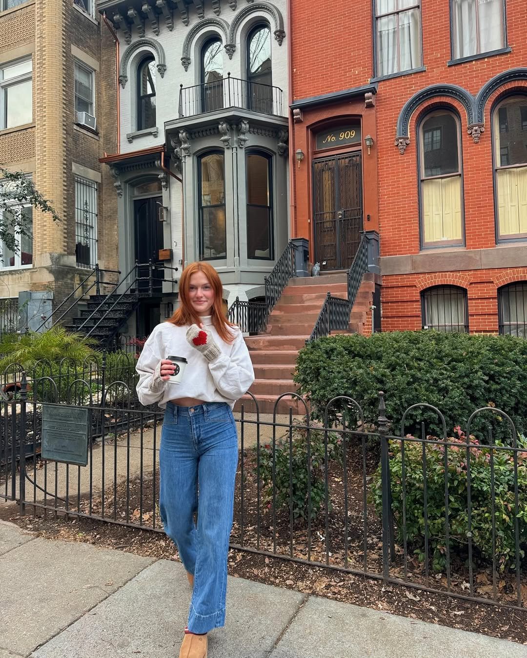 There’s something about a cozy sweatshirt and straight-leg jeans in front of brownstones that just hits. It’s relaxed, a little nostalgic, and perfectly city-coded.