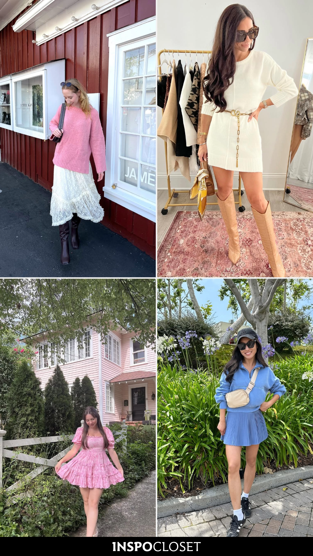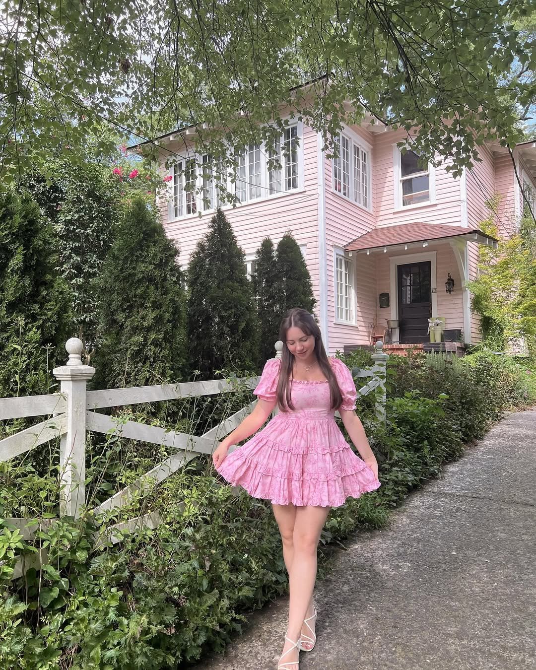 That pink puff-sleeve mini in front of the matching pastel house? It’s giving modern-day fairytale. Soft, romantic, and unapologetically feminine.