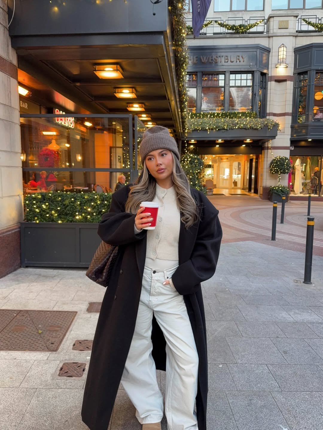 Long black coat, neutral knits, beanie, coffee in hand — this is winter dressing done right. The soft cream tones under the dramatic outer layer create that chic contrast that always works.