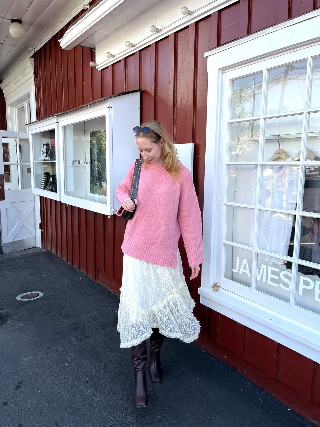 Oversized pink knit over delicate lace? Yes please. The texture play here is everything — soft, chunky, flowy, structured boots to finish it off. It’s romantic with a little edge.