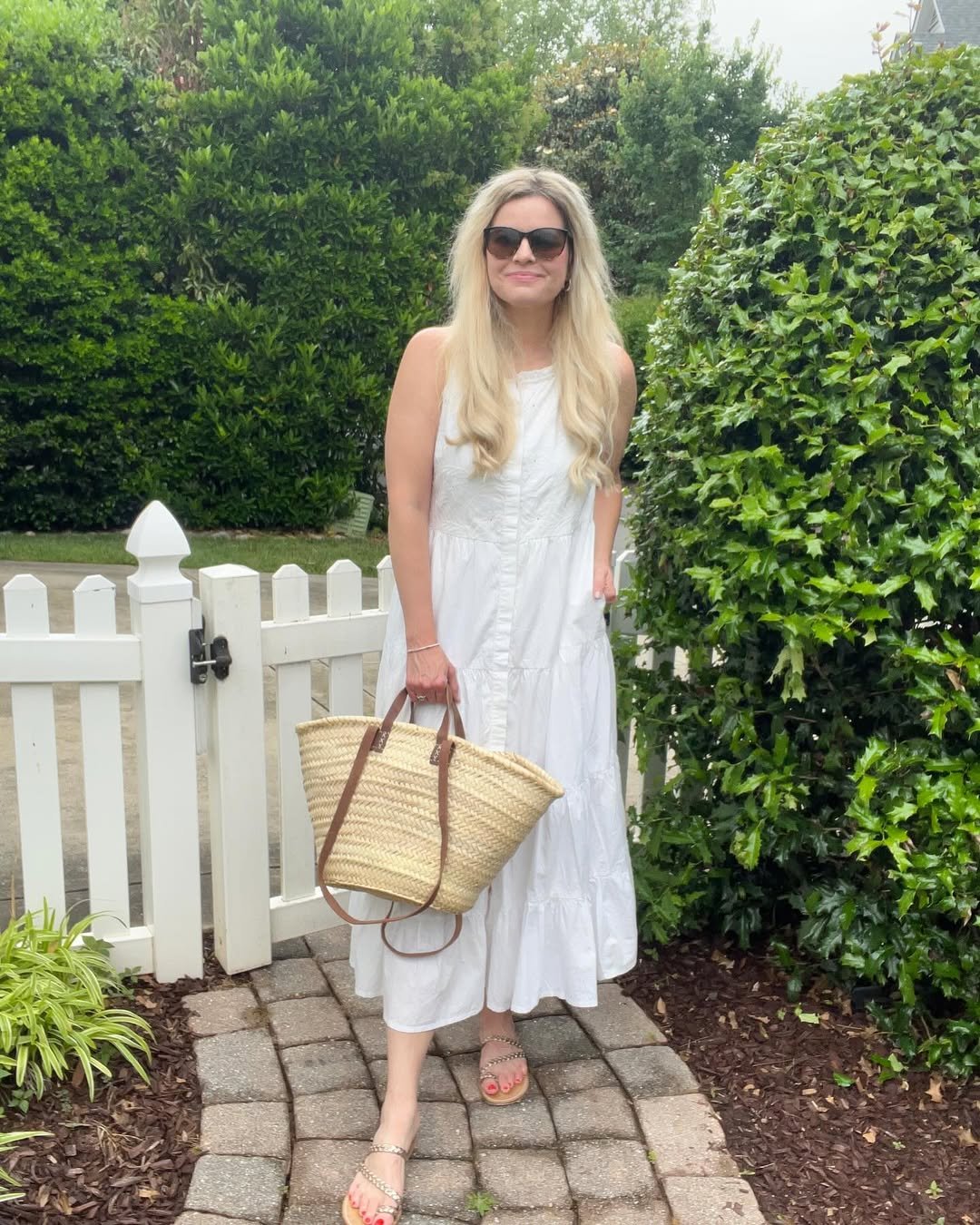 A flowy white midi dress with simple sandals and a woven tote is the definition of effortless. Clean, airy, and endlessly wearable.