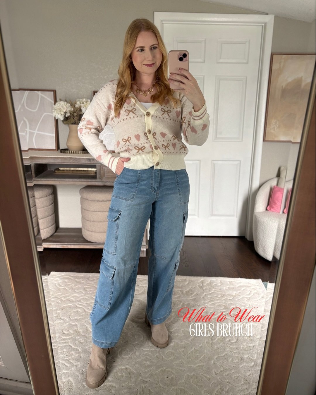 This cardigan and wide-leg denim moment is peak “cute but comfy.” The heart and bow details add personality, while the cargo-style jeans keep it grounded and cool.
