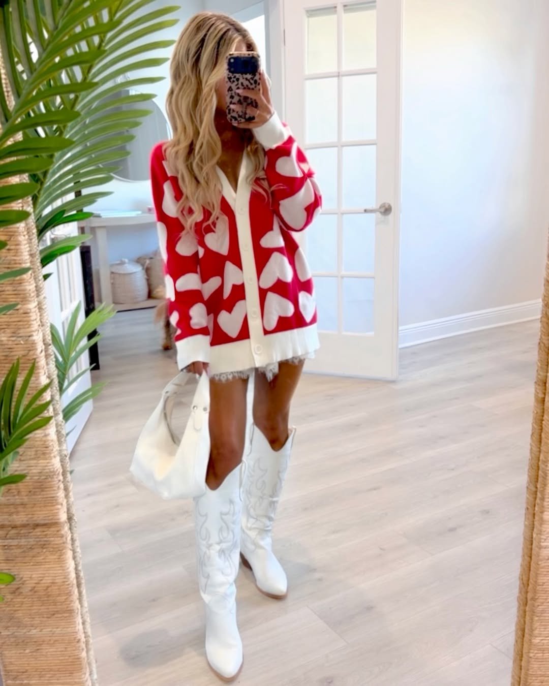 An oversized heart cardigan with white boots? Say less. This look balances playful and statement-making in the best way.