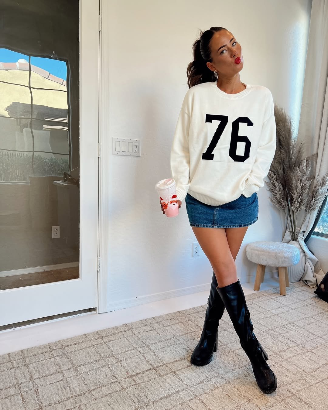 This is how you do casual without looking even slightly careless. The oversized “76” sweater, mini denim skirt, and knee-high boots combo? It’s giving model-off-duty but still grabbing coffee like the rest of us. Effortless, a little sporty, a little flirty.