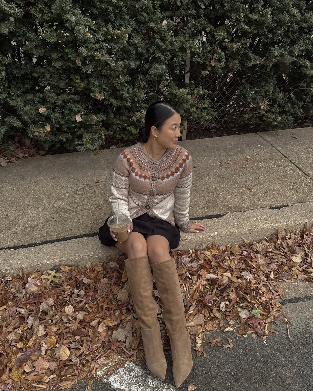 Plaid, mini skirt, knee-high boots — this is sleek fall energy. The structured silhouette and darker palette make it feel elevated, while the oversized top keeps it current.
