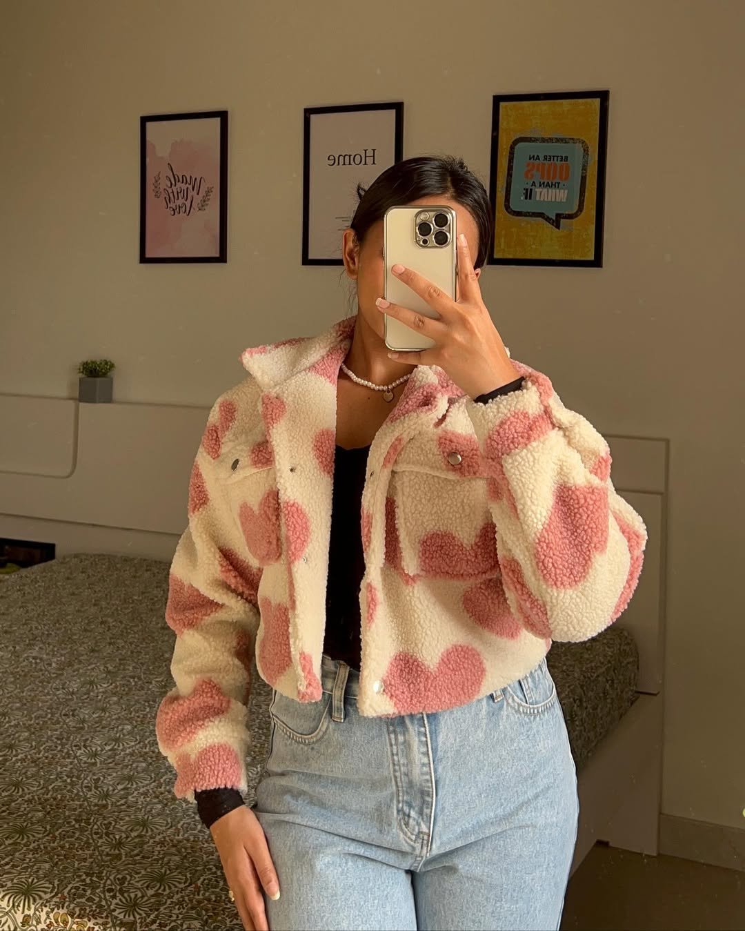 The heart-print teddy jacket over a simple black top and jeans? Adorable. It’s cozy-core with a little personality twist.