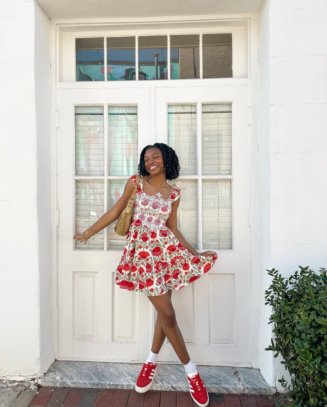 Okay but this dress? Pure serotonin. The red floral print pops against the white backdrop, and the red sneakers tie it all together in the cutest way. It’s playful without feeling costume-y.