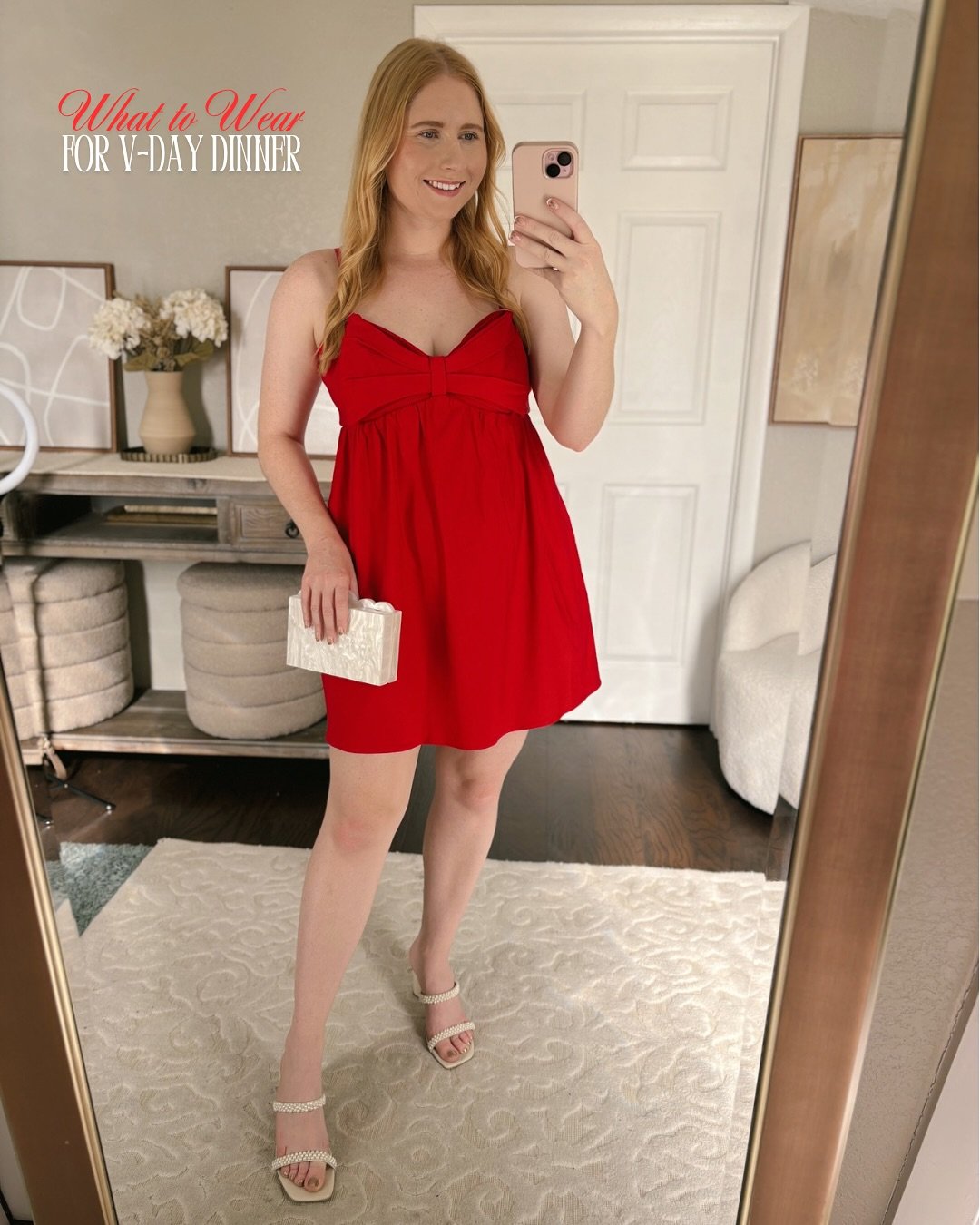 A red mini with a bow detail is basically Valentine’s Day coded — but this one keeps it soft, not over-the-top. The simple heels and neutral clutch let the dress be the main character.