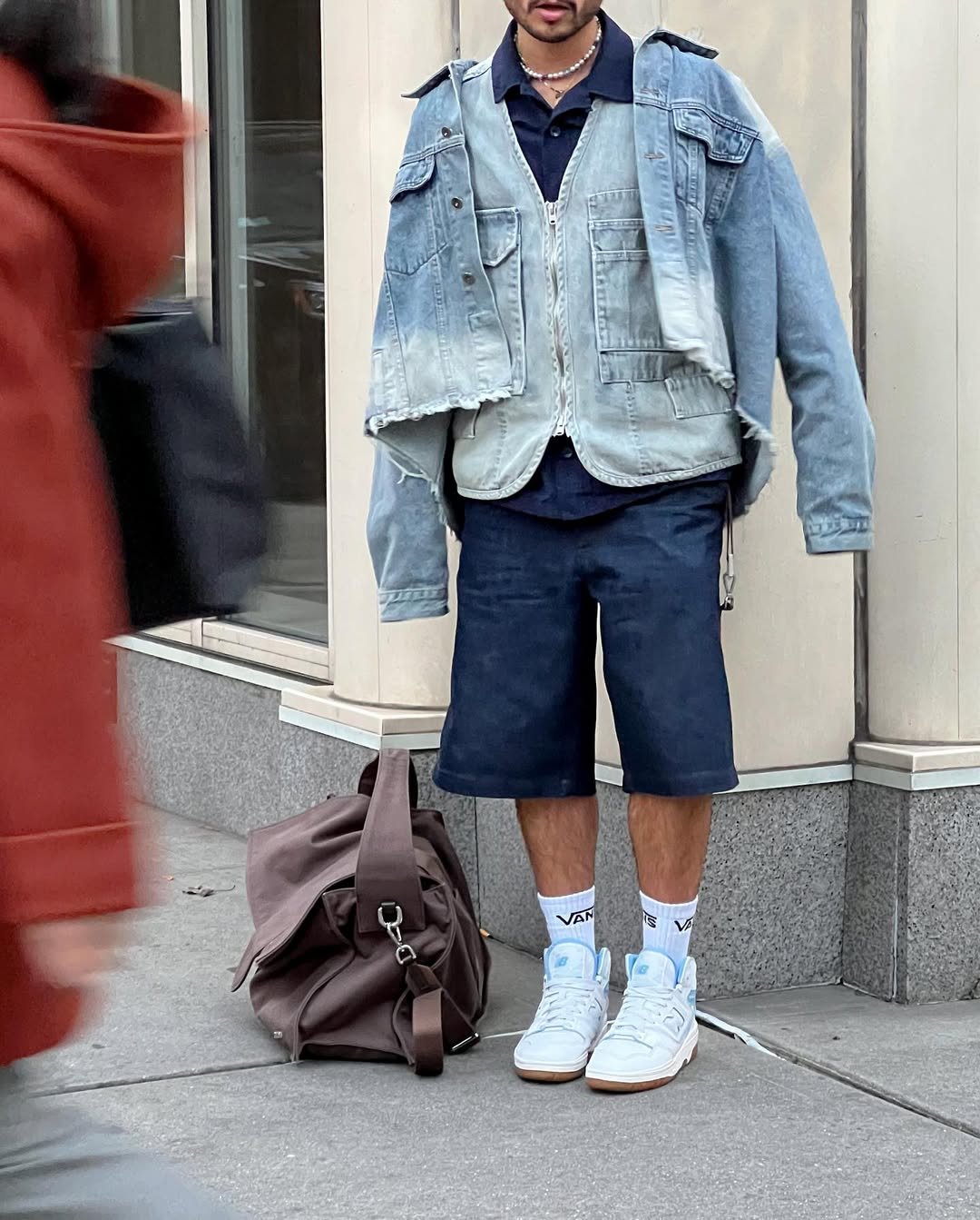 A cropped denim jacket thrown over a navy polo and tailored shorts feels playful yet intentional. The high socks and sneakers give it a sporty twist, while the layered jacket adds depth.