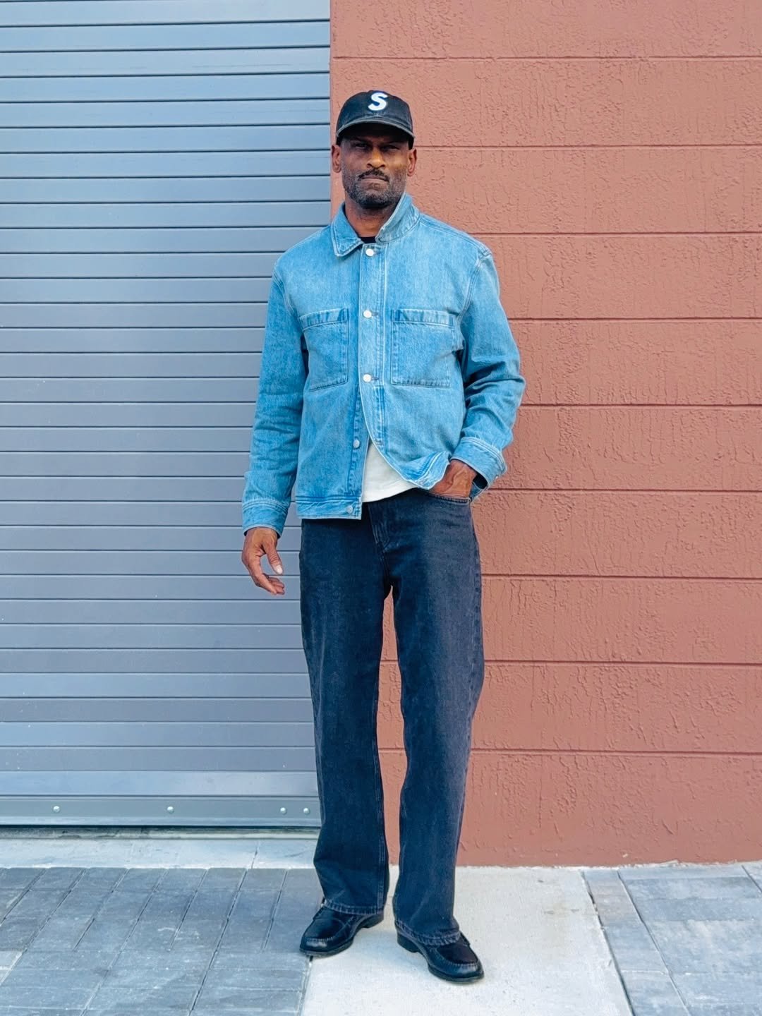 A deep indigo denim jacket paired with tailored black trousers shifts the vibe instantly. The clean black tee and polished shoes make the jacket feel almost tailored.