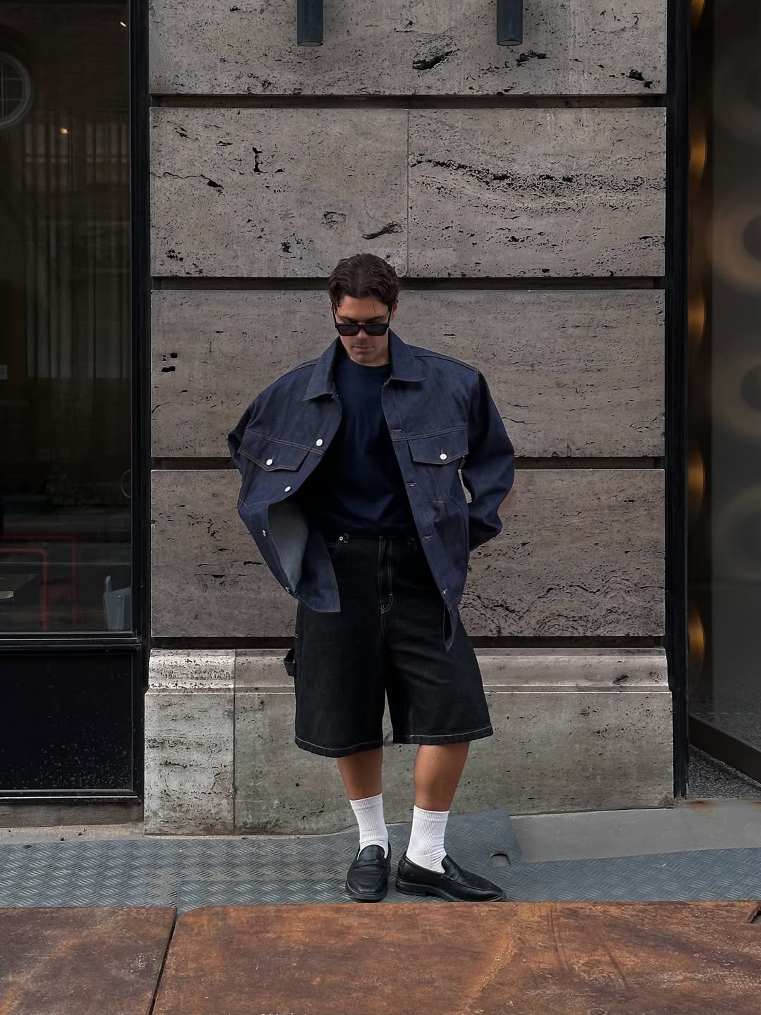 An oversized denim jacket paired with wide cut shorts and crisp loafers feels directional and fashion forward. The white socks add that deliberate edge that makes you look twice.