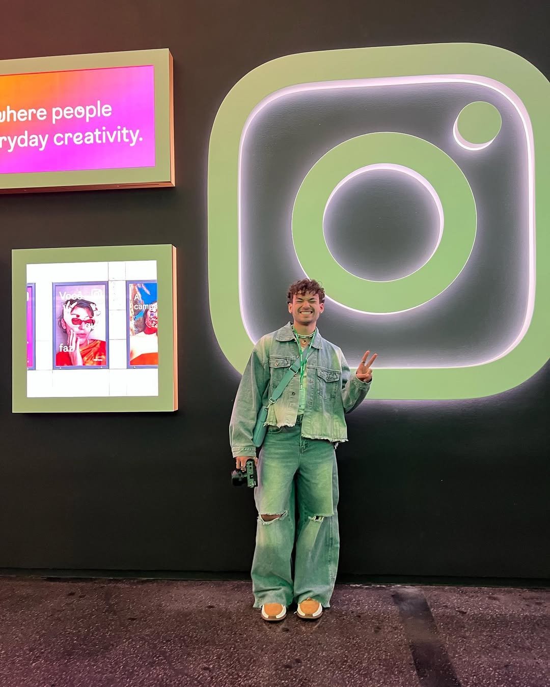 Oversized, washed denim layered with wide leg jeans feels expressive and relaxed. The proportions are bold, almost art school energy, especially styled against that glowing backdrop.