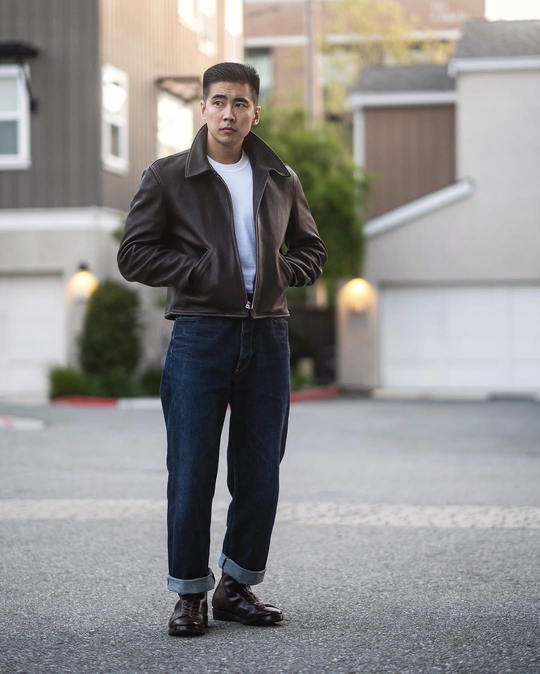 Deep indigo denim with structured leather up top? That’s a grown-man combo. The cuffed jeans and polished boots keep everything intentional.
