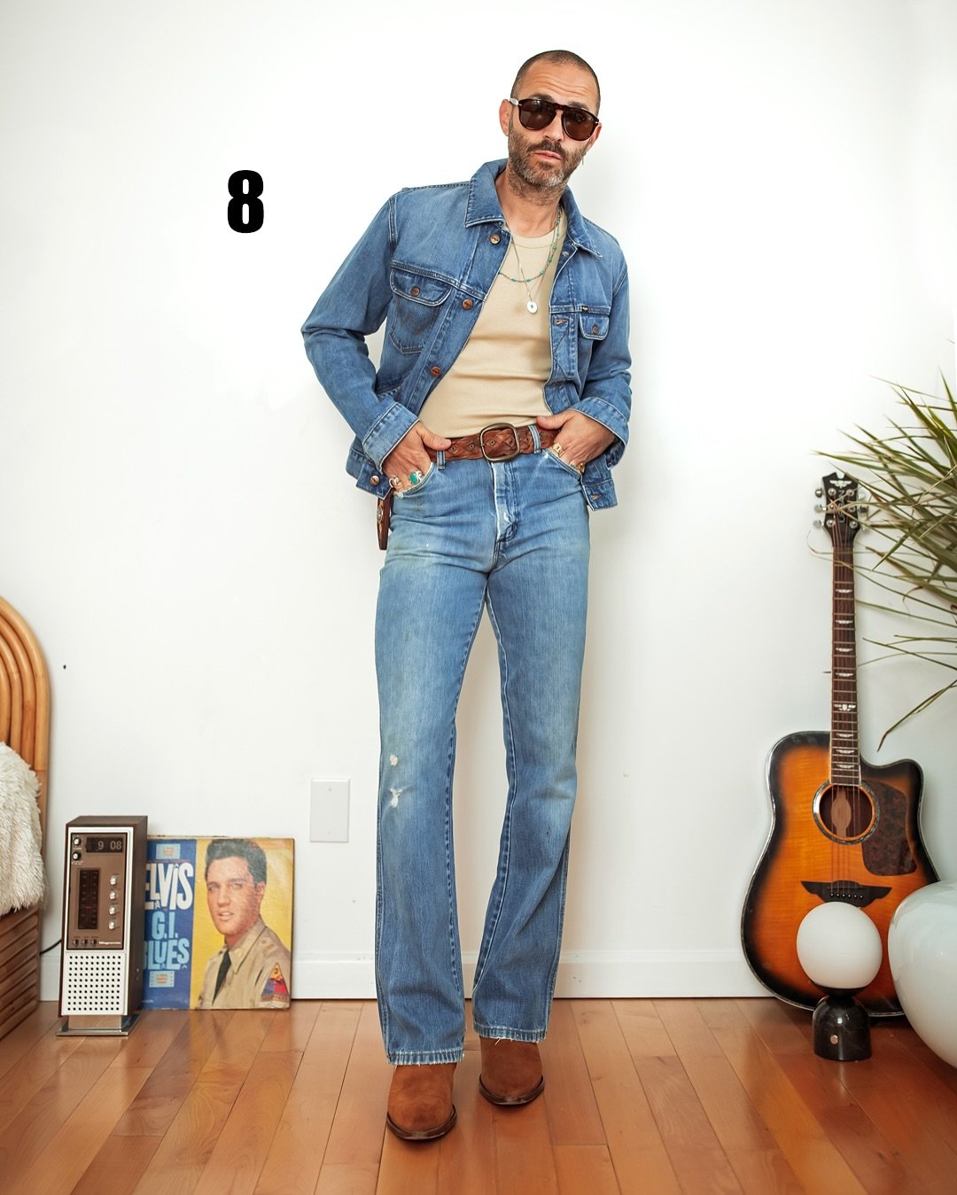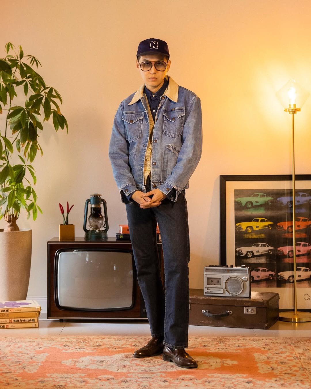 This one leans fully into retro charm. The classic blue denim jacket layered over textured pieces, paired with dark denim and leather shoes—it’s timeless without feeling costume-y.