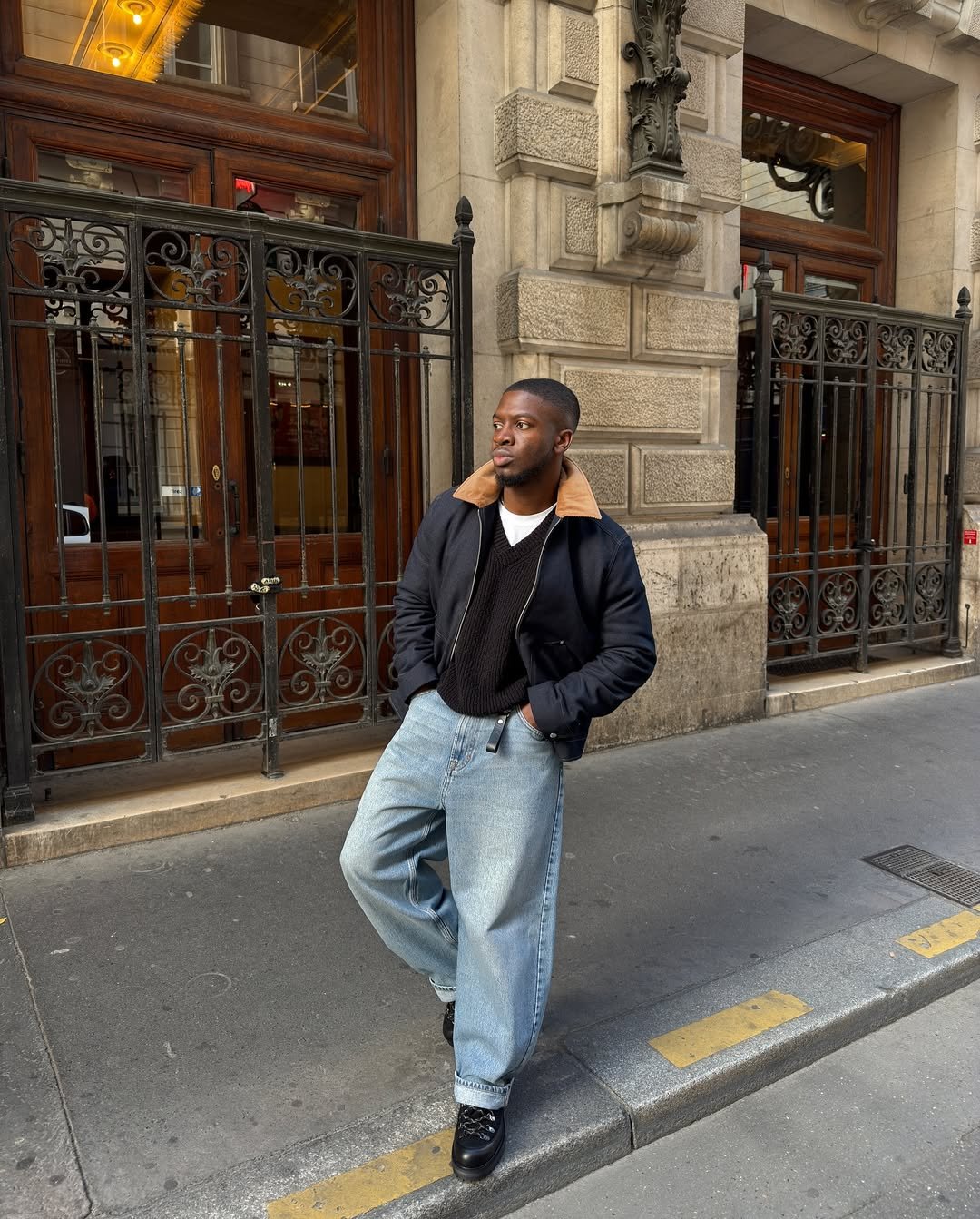 A navy jacket with a contrast collar layered over a knit and relaxed light wash jeans brings balance to classic menswear and modern ease. The muted palette keeps everything cohesive and calm.