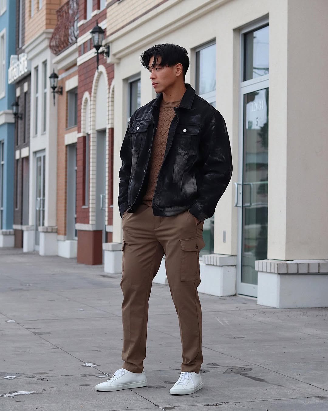 A black denim jacket over warm brown tones? That’s how you soften edge with polish. The textured knit and tailored cargo pants give depth without screaming for attention.