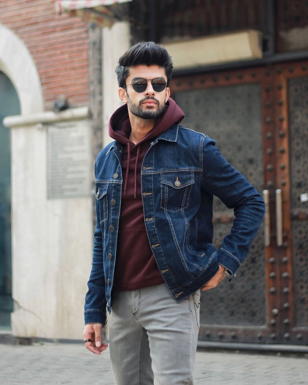 Dark denim jacket layered over a rich-toned hoodie? Instant depth. The contrast stitching and fitted jeans keep it sharp, not sloppy.