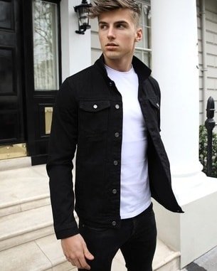 This look is smooth. The darker denim jacket layered over a crisp tee and paired with tailored dark jeans leans classic, but not stiff. Add polished leather shoes and suddenly it’s giving quiet confidence instead of weekend casual.