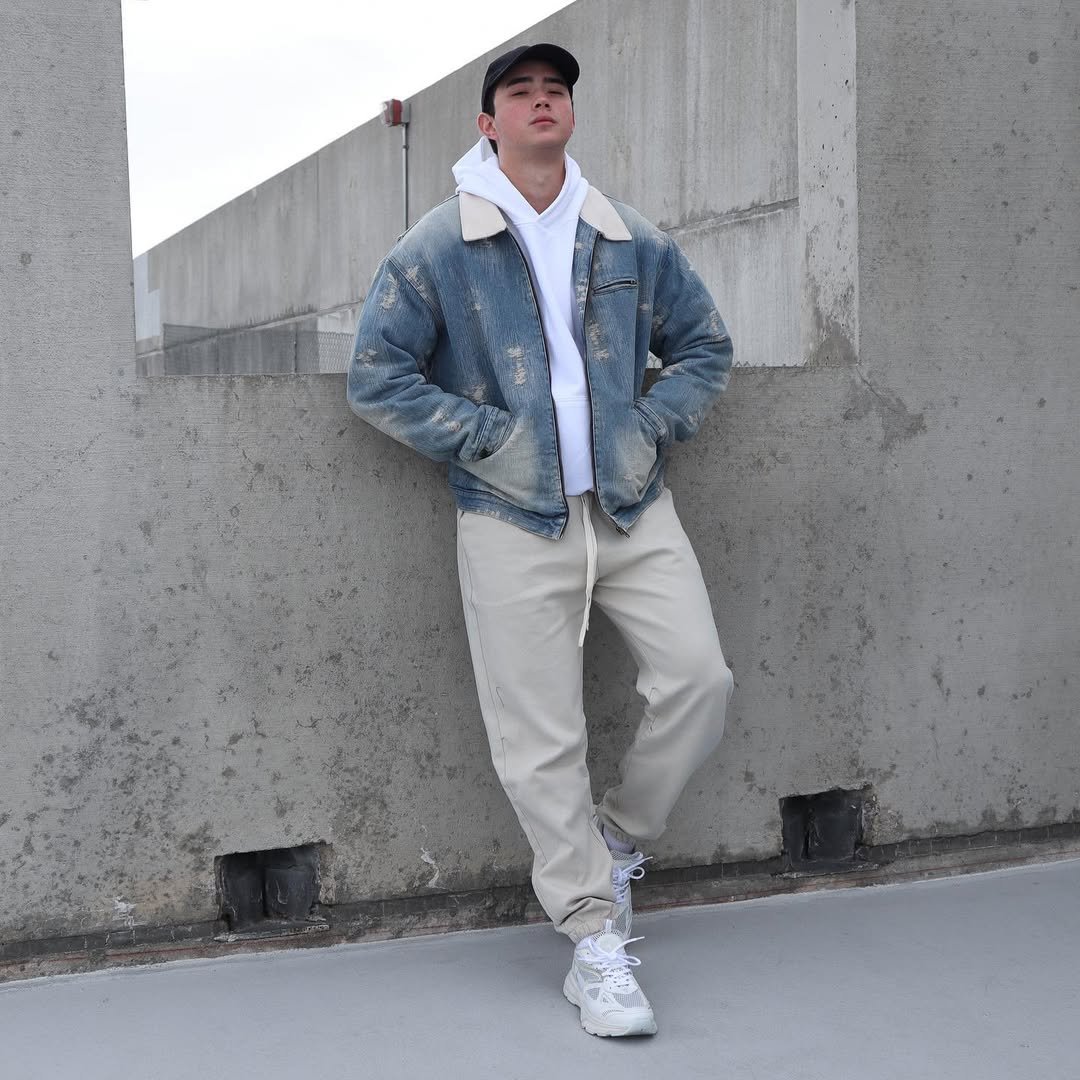 A sherpa lined denim jacket over a hoodie and relaxed joggers feels effortless and current. The soft gray and white tones keep the look cohesive and easy on the eye.