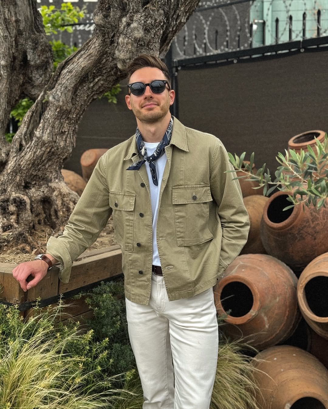 An olive toned denim jacket over a crisp white tee and cream trousers feels fresh and grounded. The bandana at the neck adds personality without overpowering the look, almost like a quiet nod to old school European style.