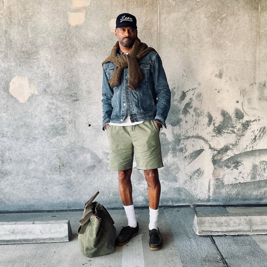 This is how you do laid-back without looking lazy. The denim jacket over olive shorts, crisp white socks, and chunky shoes feels intentional—like you actually thought about proportions (because you did). The scarf detail? Quiet flex.