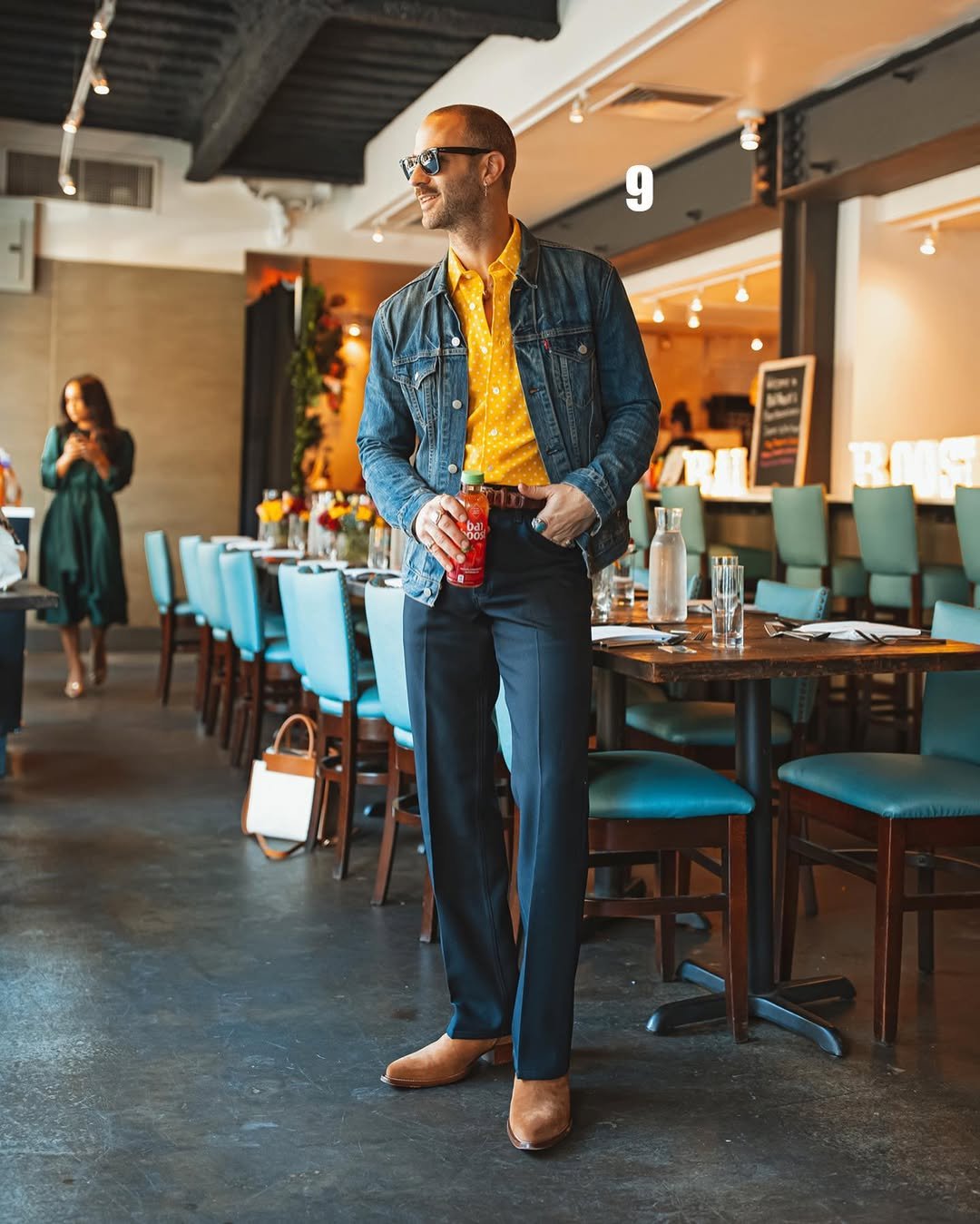 A structured denim jacket layered over a bold yellow button down feels like confidence in motion. Paired with tailored dark trousers and suede boots, the whole look walks that perfect line between polished and relaxed. It is giving weekday lunch meeting that turns into cocktails without missing a beat.