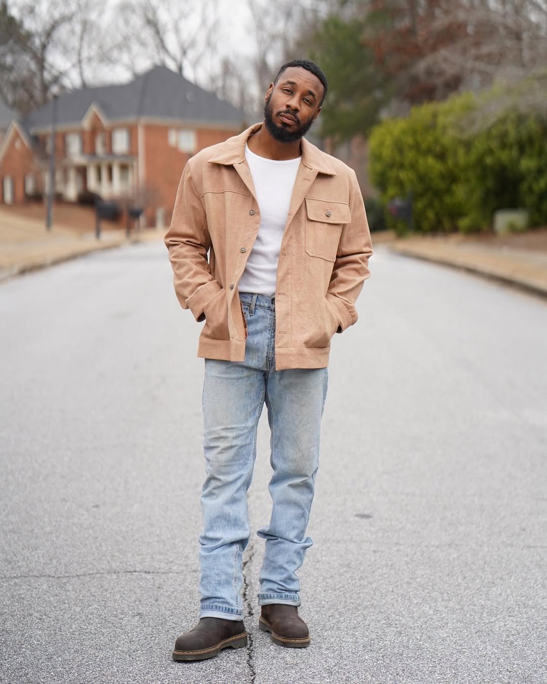 Technically not classic blue denim—but same jacket silhouette, different texture. The tan suede version with light-wash jeans feels warm, masculine, and super wearable.
