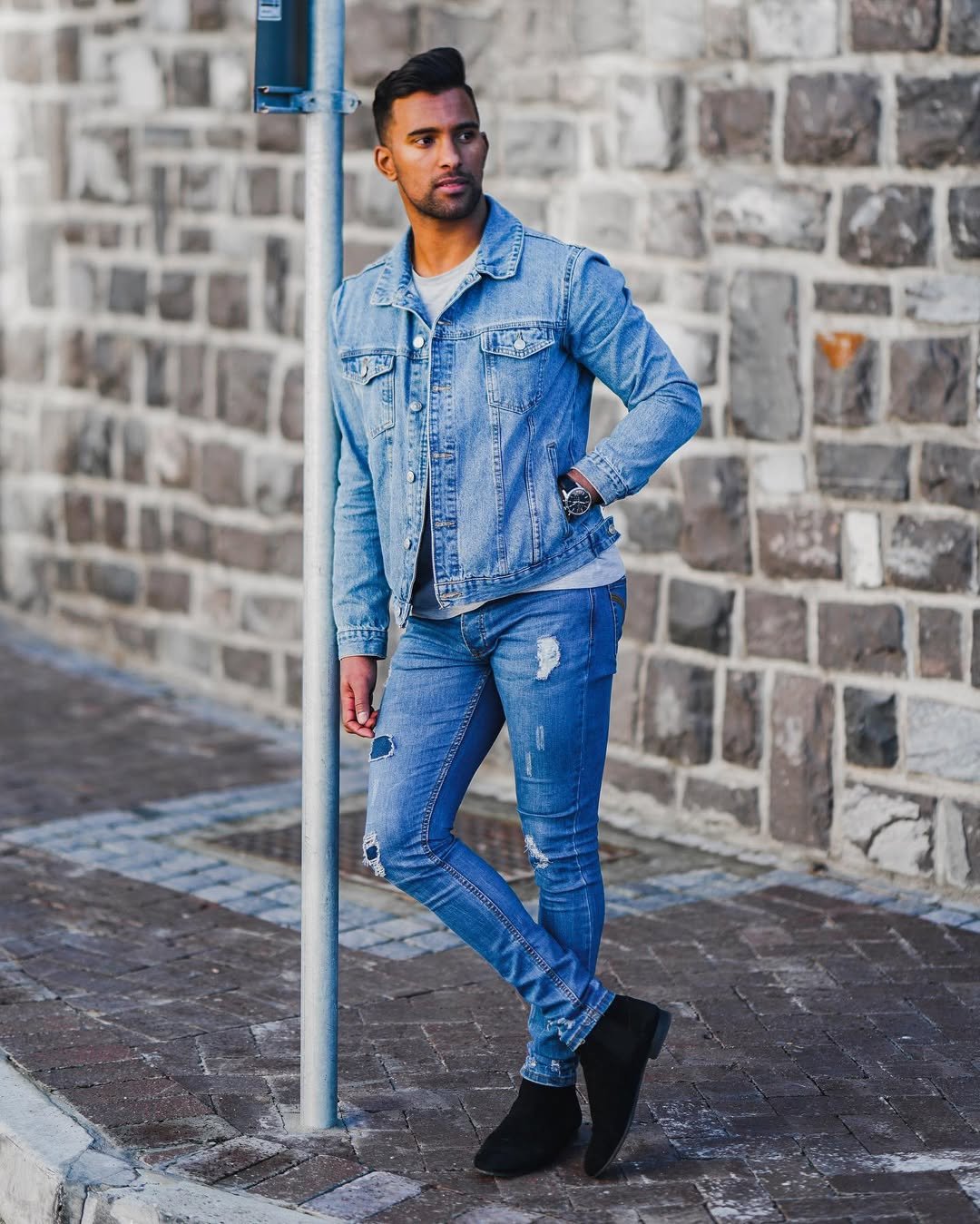 A light wash denim jacket paired with slim distressed jeans and black Chelsea boots leans into clean city style. The silhouette is streamlined, sharp, and just rugged enough to feel lived in.