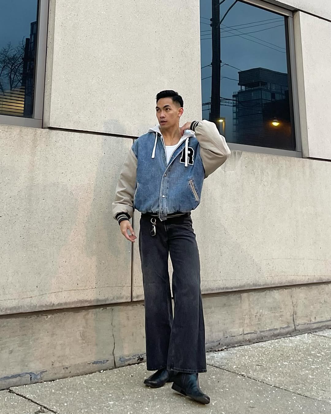 The denim varsity hybrid jacket brings that collegiate nostalgia—but the wide-leg black trousers make it current. It’s sporty, but not stuck in high school.