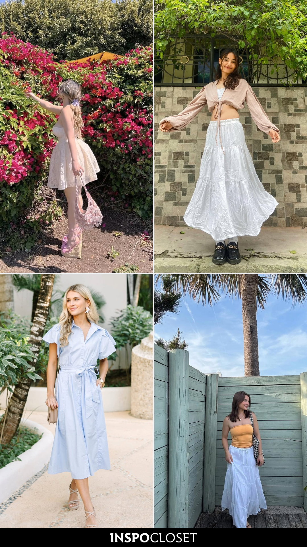 There’s something effortlessly cool about this look. The strapless white top paired with a silky floral midi skirt creates that perfect mix of relaxed and polished, like the kind of outfit you’d wear for a sunny afternoon wandering through palm-lined streets.