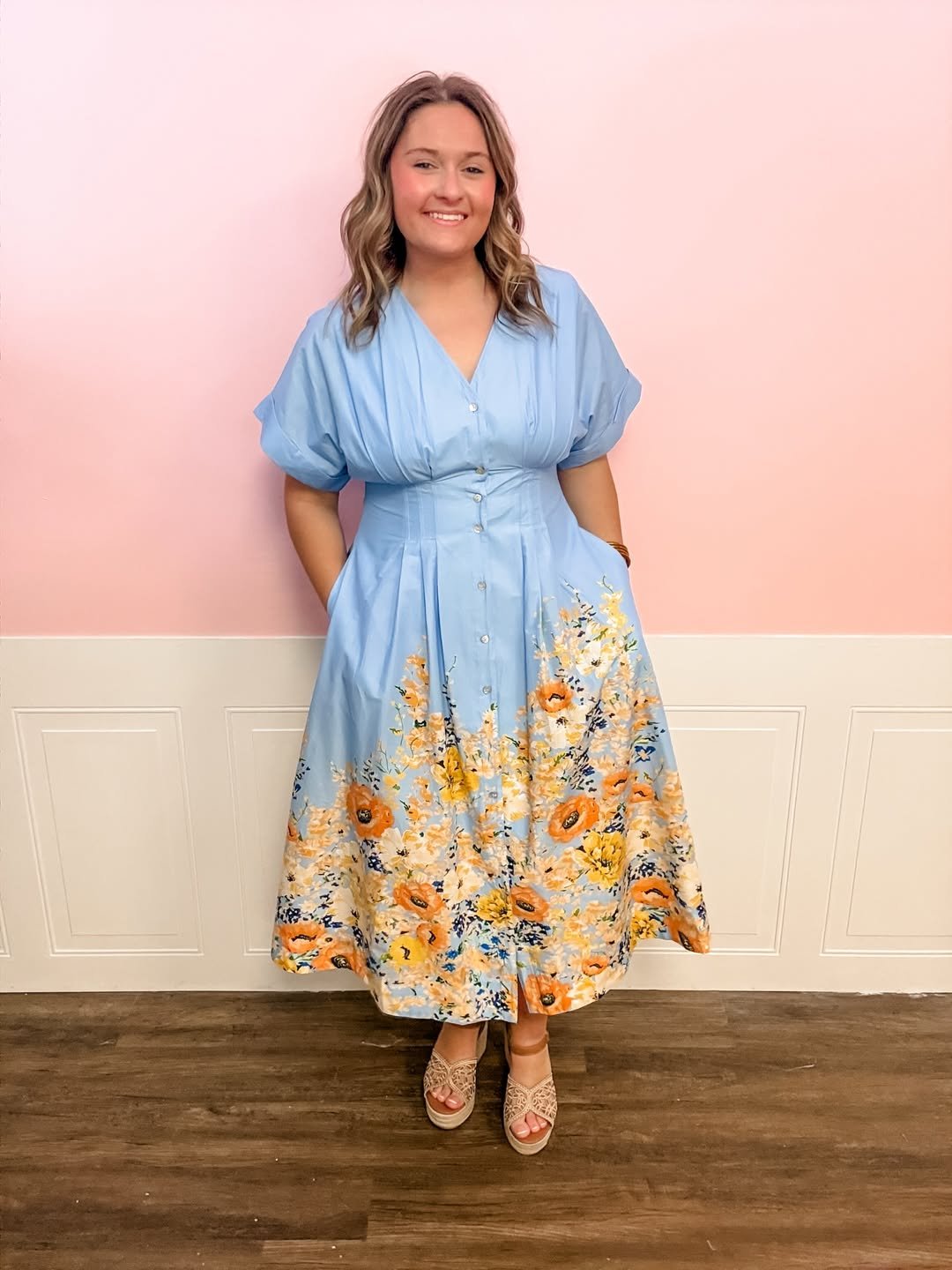This dress feels like wearing a watercolor painting. The soft blue base paired with warm yellow and orange floral details gives the skirt a beautiful garden-inspired finish.