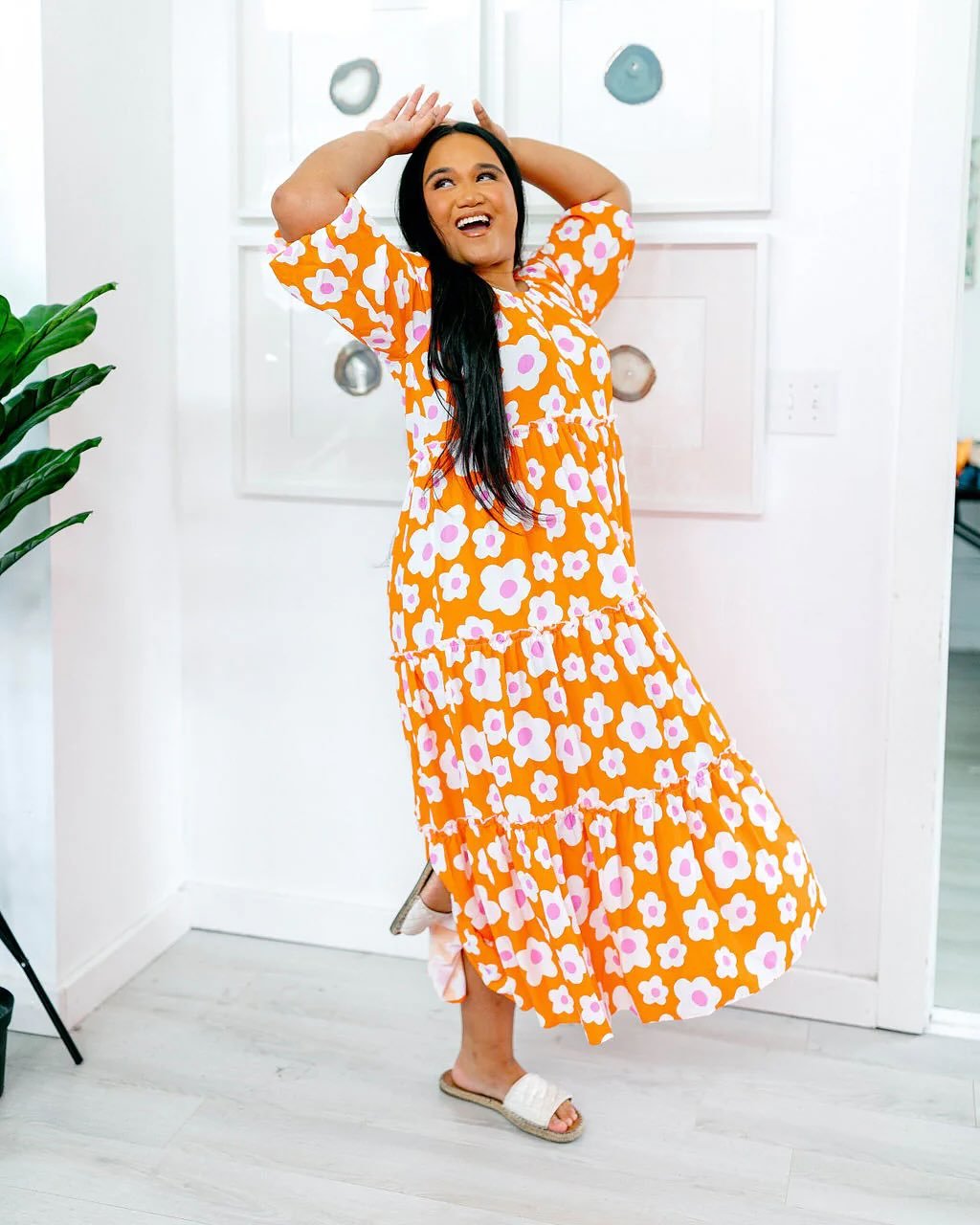 And the silhouette keeps it easy to wear. Puff sleeves, a tiered skirt, and a relaxed fit make it the kind of dress you try on “just for fun”… and somehow end up taking home.