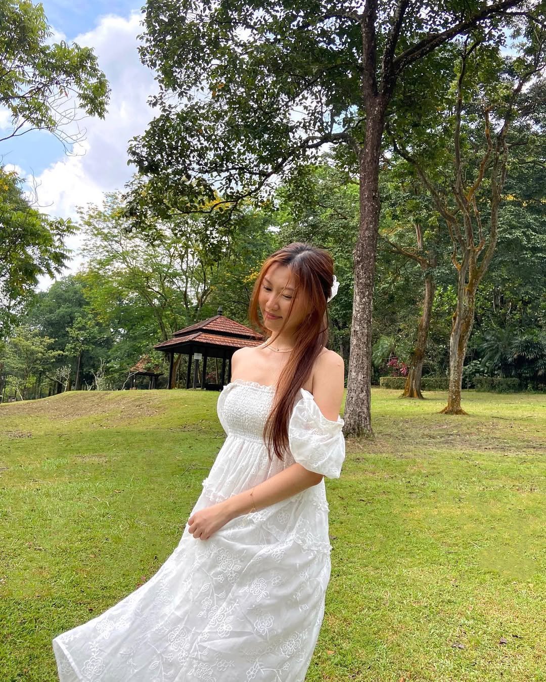 Golden hour and a flowing white dress are always a winning combination. The off-shoulder silhouette adds just enough romance while the soft, breezy fabric moves beautifully in the evening light.