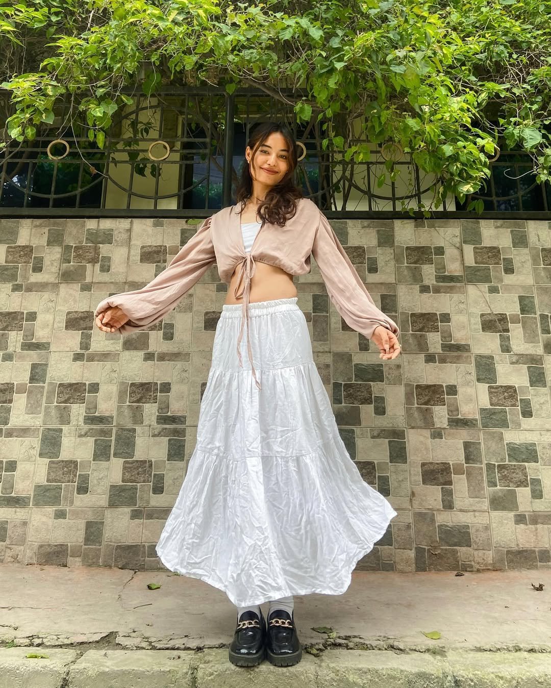 This outfit feels like a postcard from a dreamy Mediterranean afternoon. The soft white crop top and flowy pink tiered skirt keep things light and breezy, while the sneakers add that perfect “I’m exploring all day” comfort factor.
