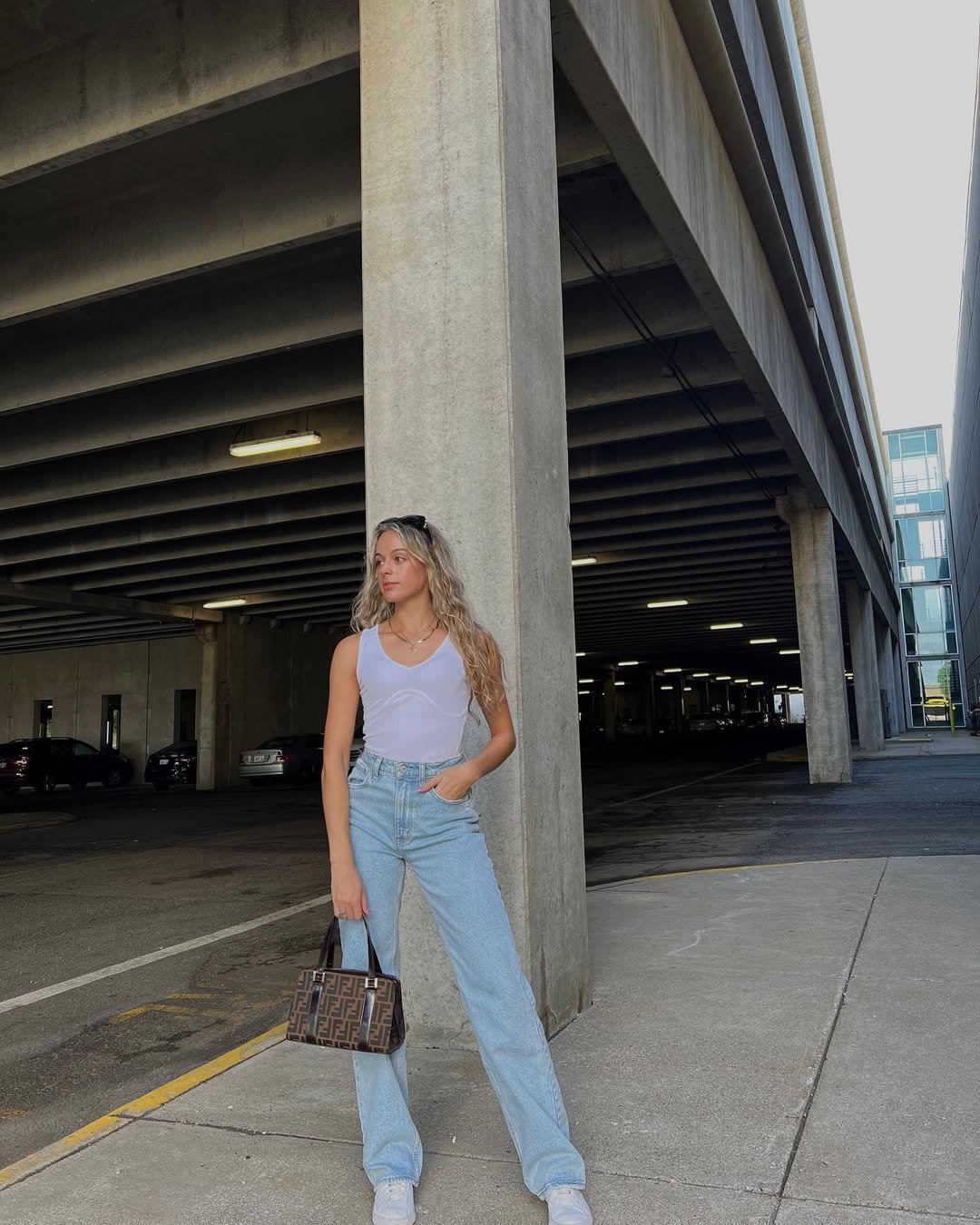 @rachel.brunelle channels that late ’90s supermodel aesthetic with a fitted white tank and high-waisted light denim. The Fendi mini bag and minimal accessories take this outfit from basic to brilliant.