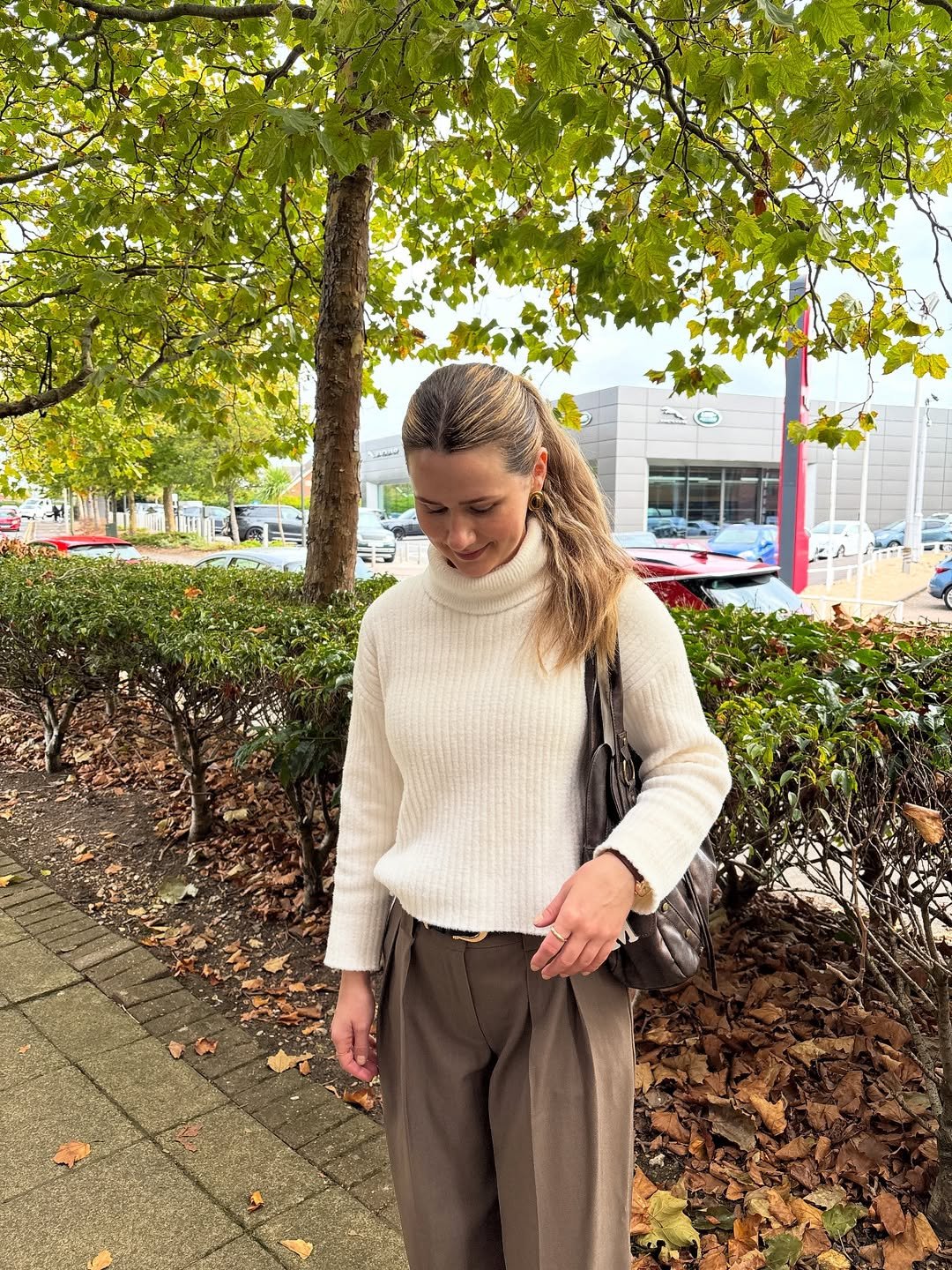 @monica.j_mon offers a cozy moment wrapped in oat and olive tones. Her ribbed cream turtleneck paired with wide-leg trousers creates a look that’s both refined and perfectly in tune with the turning leaves behind her. The soft pull-back pony and oversized hoop earrings elevate this simple combo into something crisp and quietly luxe.