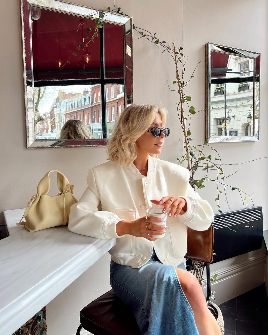 This cafe moment is so polished. The creamy bomber paired with a longline denim skirt feels unexpected but just right. The tonal look, rounded off with a lemony handbag and layered jewelry, creates a sense of ease and elegance that’s very 2024.