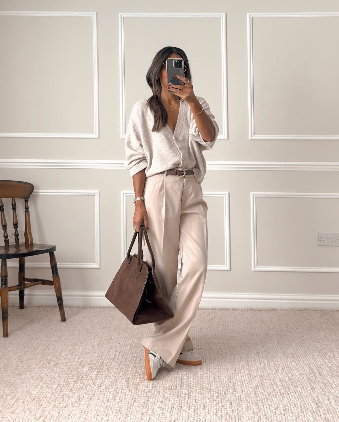 This palette is pure creaminess. @neetastarling (1) styles wide-leg trousers with a slouchy knit and oversized suede tote, all in warm, neutral tones that whisper luxury. The sneakers keep it grounded, and the gold jewelry adds that little glint of intention.