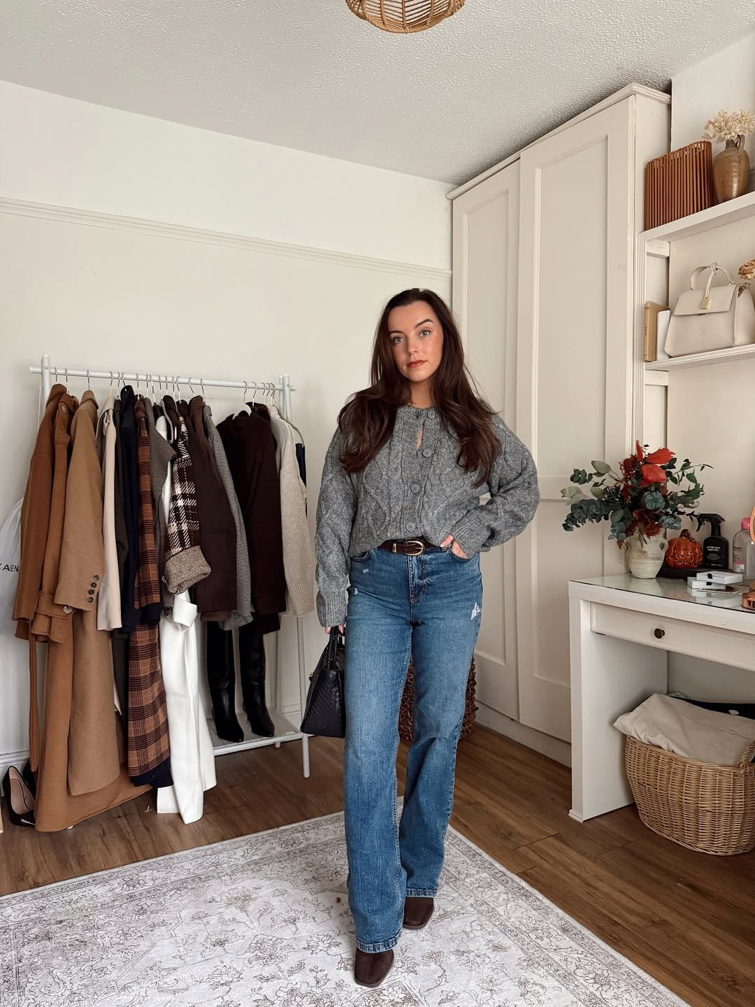 I especially love the surrounding details: the clean wardrobe rail, warm-toned outerwear, and woven textures echo the outfit’s balance of comfort and structure. It’s the kind of outfit that moves seamlessly from errands to coffee dates without skipping a beat.
