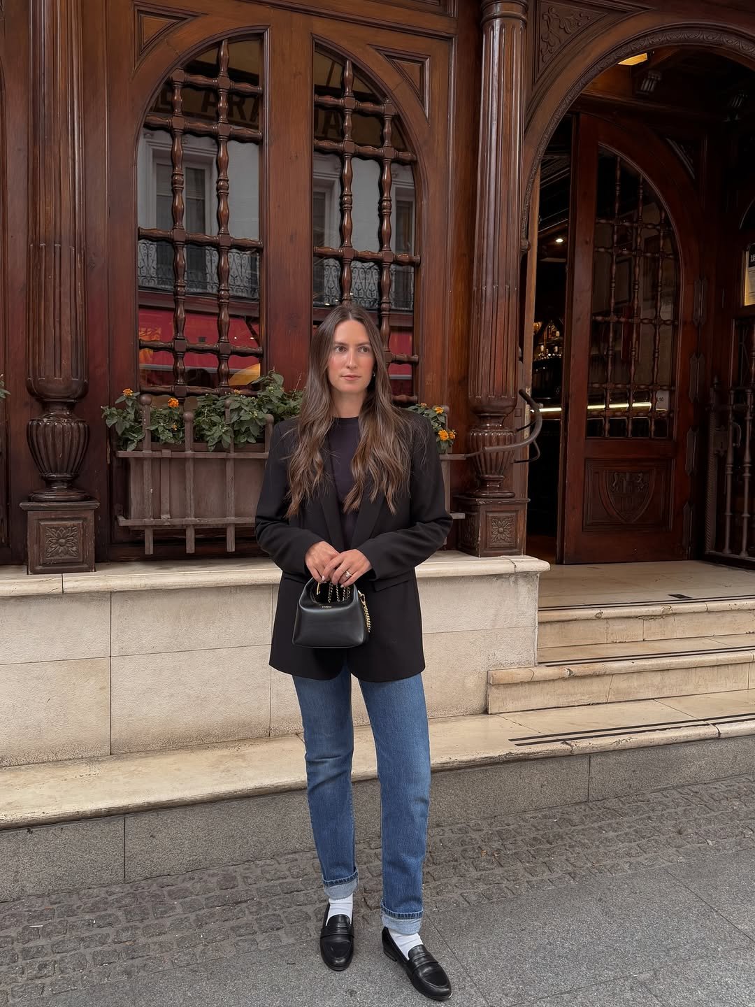 There’s something about a sharp black blazer, vintage-wash denim, and penny loafers that feels like the fashion equivalent of a well-crafted espresso. @itsrandilauren nails that balance between structured and relaxed, pairing cuffed jeans with socks and loafers in a way that’s undeniably “quiet luxury.” The micro handbag and pin-straight hair seal the deal—this look is downtown chic with just a hint of Parisian restraint.