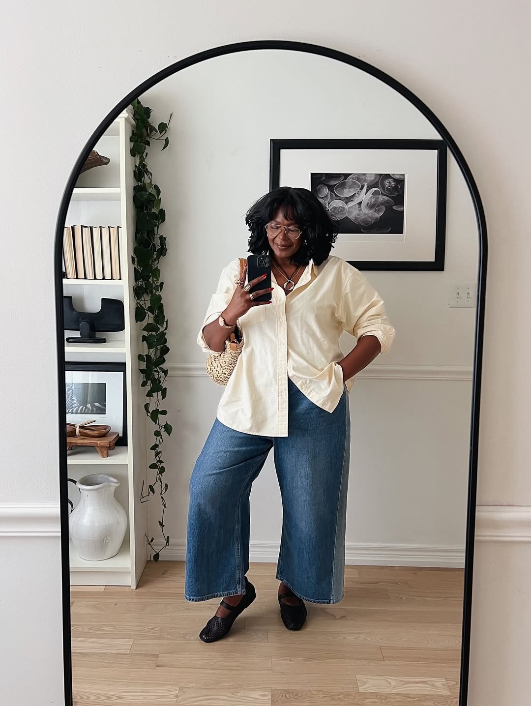 It gives “weekend in the city” energy, with a hint of vintage polish. The woven bag adds texture, the black flats keep it grounded. A simple, confident look that always delivers.