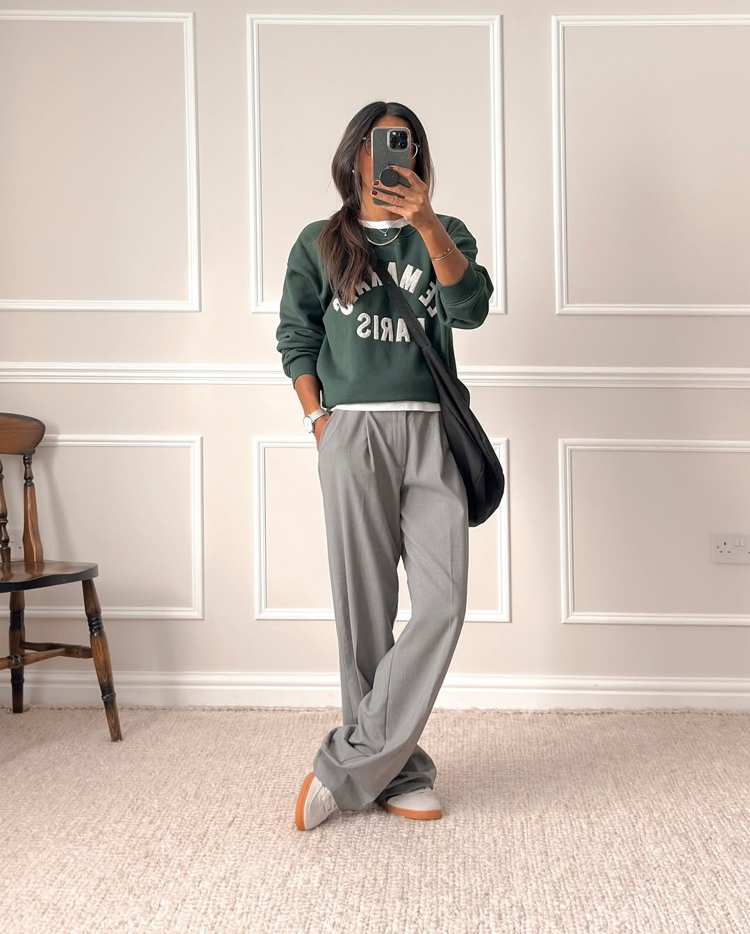 @neetastarling (2) brings her signature comfort-meets-polish vibe again with this rich forest green sweatshirt and light grey trousers. The drape of the pants softens the sporty graphic, and her classic sneakers pull the whole look into street-style territory.