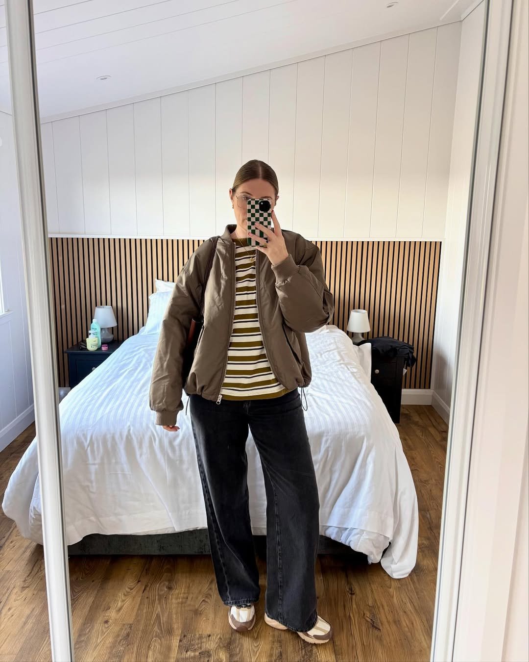 The palette here is so easy on the eyes: warm taupes, deep blacks, and subtle stripes all wrapped into one laid-back look. The bomber jacket adds structure, while the wide-leg jeans and sneakers ground everything with comfort.