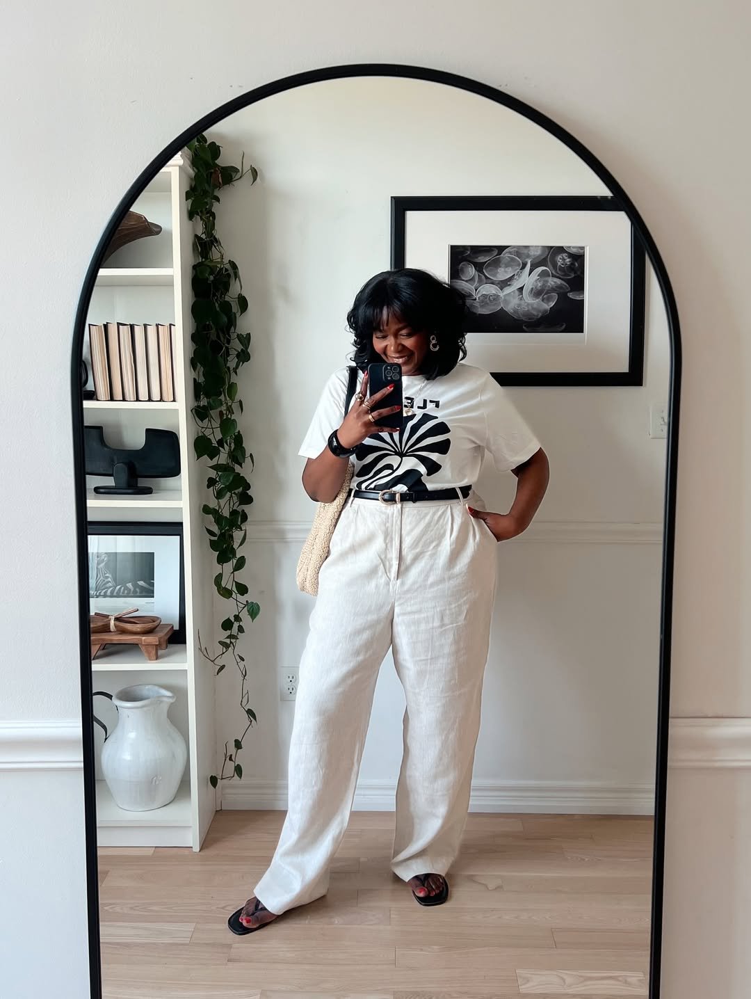 There’s something effortlessly cool about a bold graphic tee tucked into breezy linen trousers. This combo plays with contrast — edgy meets natural — and it totally works. The black belt adds definition, while the linen keeps things soft and wearable.