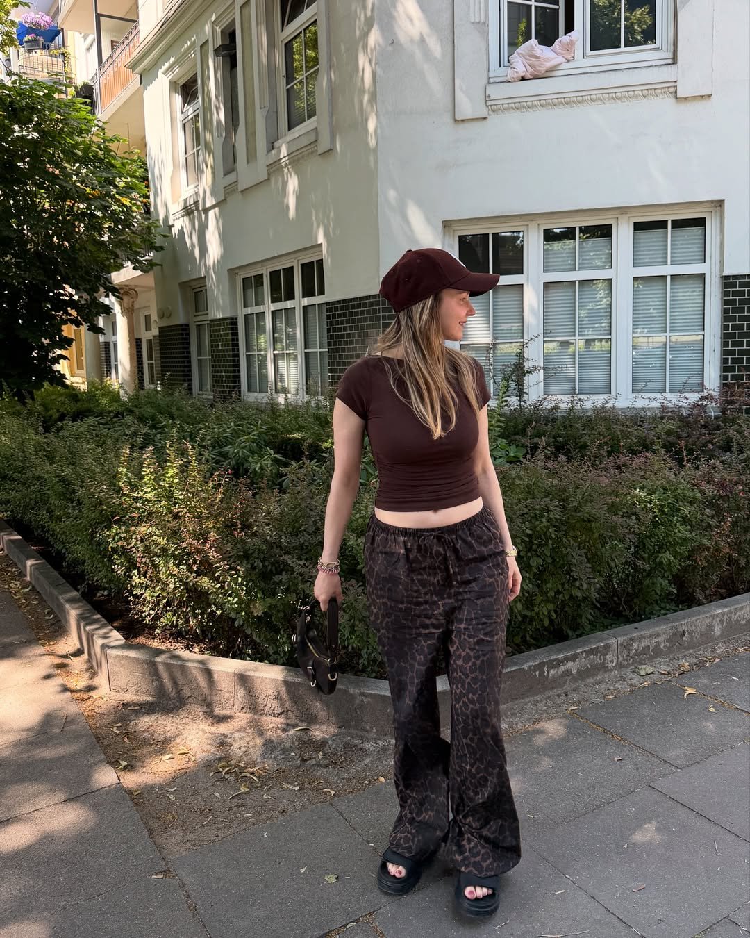 This outfit says “weekend escape” in the best way. @mystylefiles_ wears a fitted chocolate brown tee and leopard print pants with a baseball cap in the same warm hue. The monochrome palette gives it polish, while the platform slides and slouchy silhouette keep things chill.