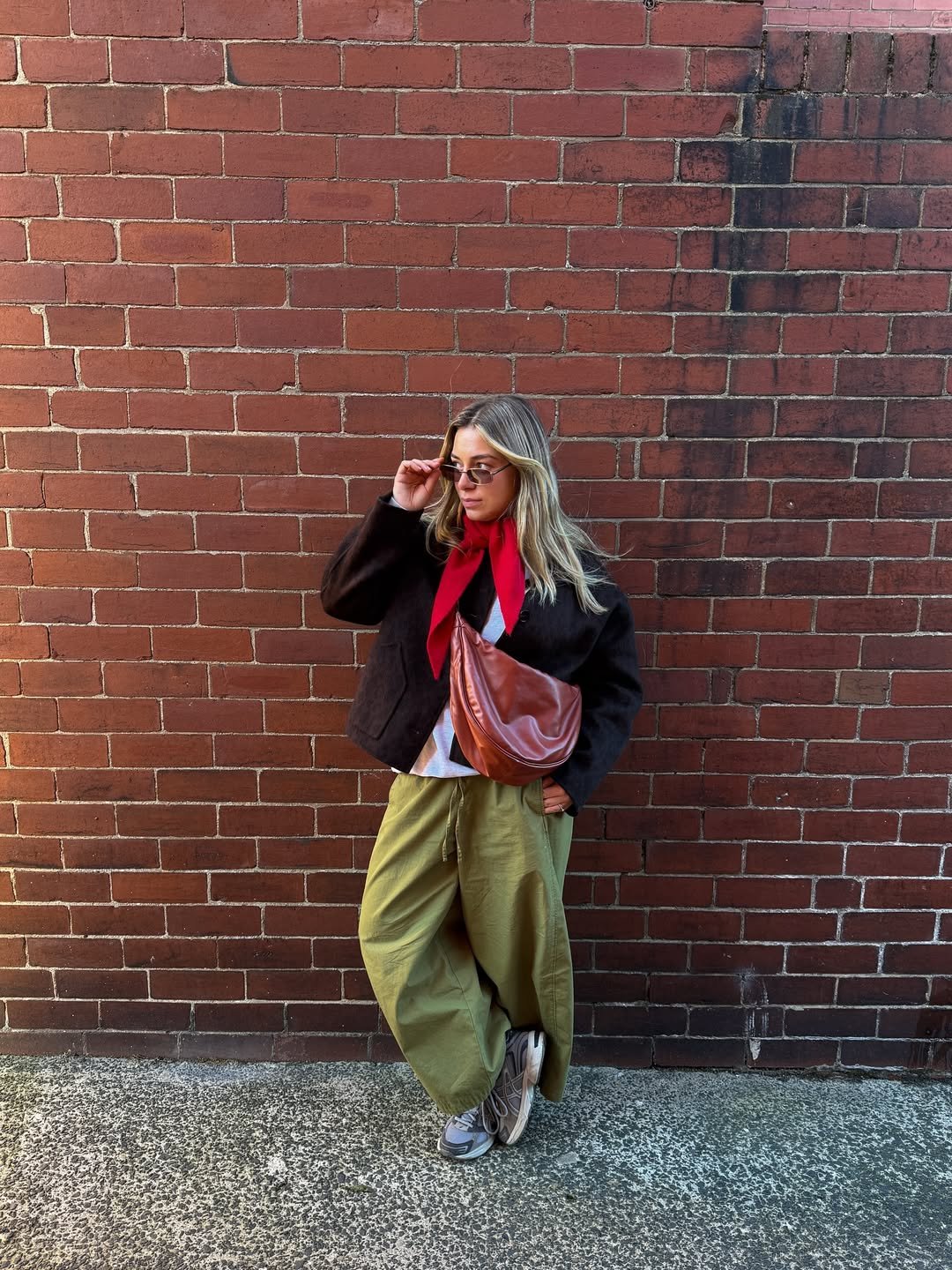This one’s got personality. A bold red scarf layered over a chocolate boxy jacket and olive parachute pants? It shouldn’t work—but it absolutely does. There’s a playfulness here that feels fashion-forward but still wearable, especially when grounded by chunky sneakers and that oversized leather crossbody.